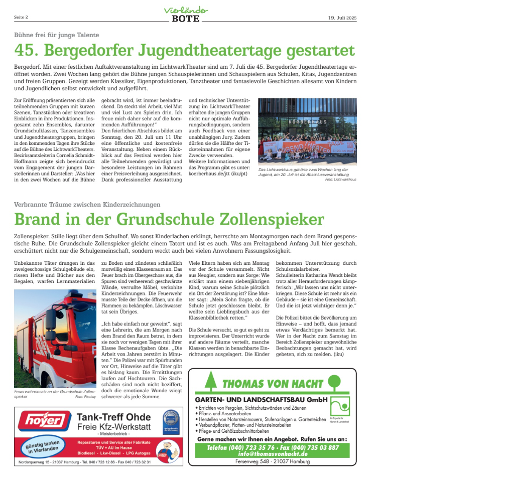 Die Jugendtheatertage 2025 begeisterten 2.800 Besucherinnen und Besucher mit einem bunten Programm aus Klassikern, Abenteuergeschichten und Eigenproduktionen. Insgesamt zehn Gruppen mit über 200 Darster*innen (5–21 Jahre), von Kita bis Tanztheater, präsentierten die beeindruckende Vielfalt des jungen Theaters.